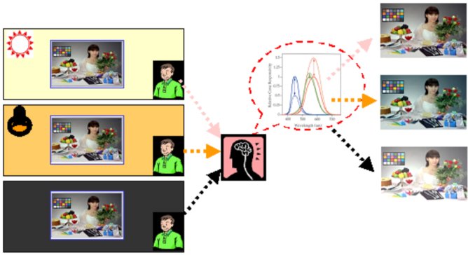Changes in the ambient conditions vary the sensitivities of the human visual system when watching a display, resulting in different perceptions under altered viewing conditions despite the same stimulus. Therefore, since a viewer s peripheral environment can be affected by artificial illumination, daylight, or fading light, algorithms are needed that can reproduce colors on a display under various types of ambient lightings as the viewing conditions are always changing.